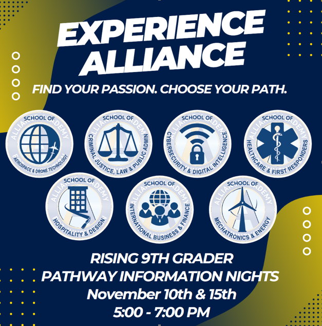 Enroll NOW for 2023-2024. Out of District Application to attend Alliance for the Class of 2027 opens Nov. Alliance Academy for Innovation.